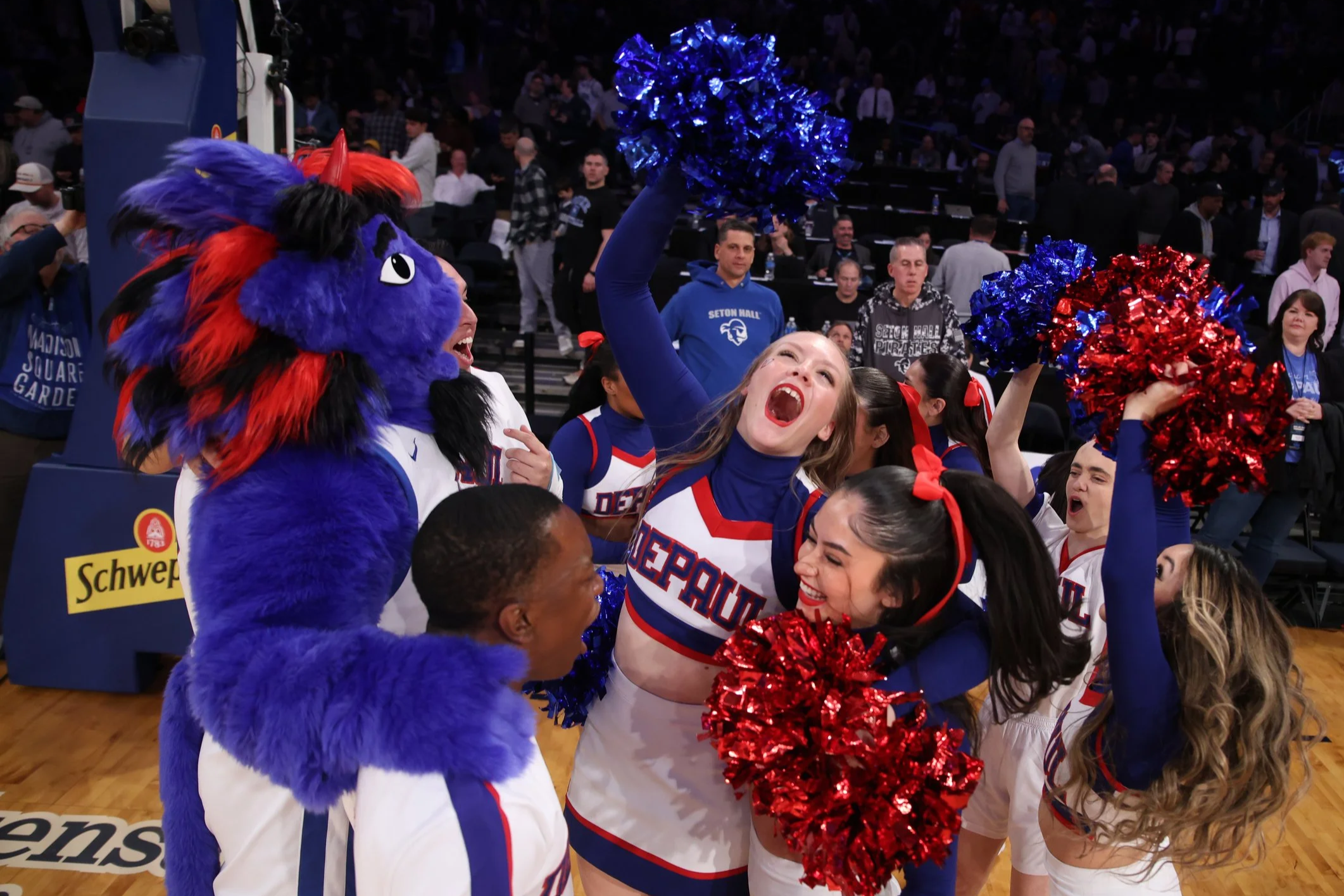 DePaul cheerleaders celebrate DePaul’s win with DIBS after the Big East game on Wednesday, March 12, 2025, at Madison Square Garden. DePaul will next play two-seeded Creighton.