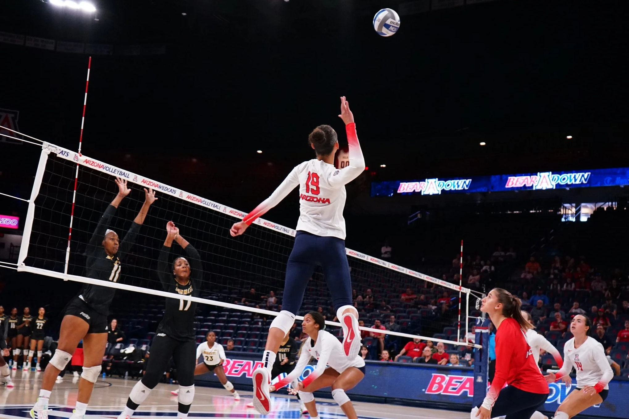 Jaelyn Hodge leaps to hit a ball over the net at the Arizona volleyball game against Alabama State on Saturday, Sept. 16, 2023. This game was part of the Wildcat Classic.
